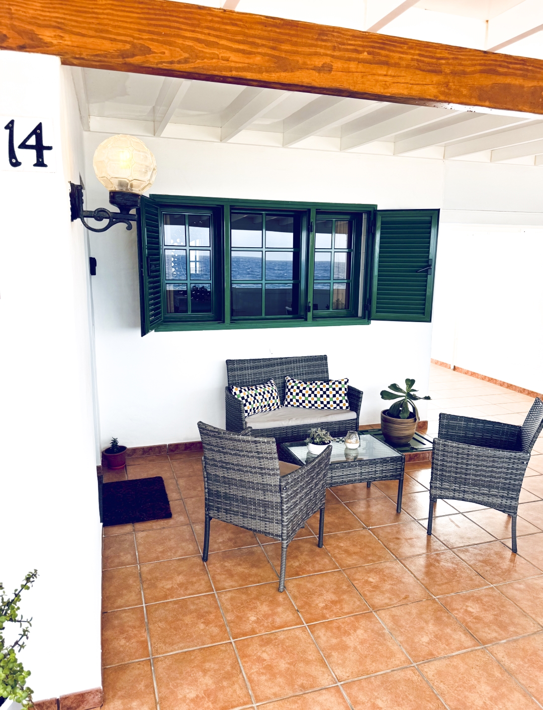 A la entrada de la casa, frente al mar, encontramos un amplio porche cubierto, que protege tanto del sol como de la lluvia o el viento, lo que hace que se pueda disfrutar de hacer vida en el exterior, frente al mar, todos los días del año.